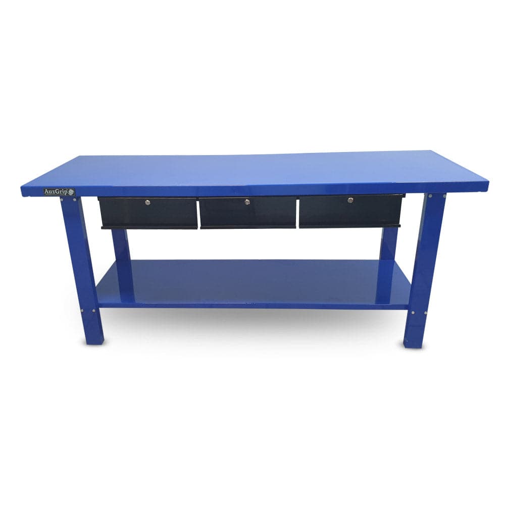This solid steel blue powder coated construction features a 2-meter-long work top and 3 black lockable drawers. It is greatly suitable for garage of workshop use and includes an additional heavy-duty shelf for storage below.