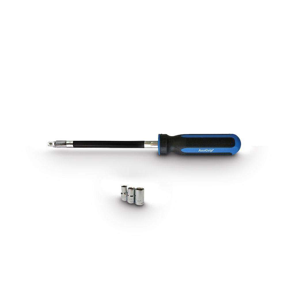 Convenient 150mm flexible shaft fitted with universal 1/4" square male drive and spring loaded ball holder allows all 1/4" drive sockets and accessories to be hand driven. Can also be used for nut end hose clamp removal loosening/replacement tightening and other procedures that are in limited access spaces. Comfortable ergonomic grip handle.
