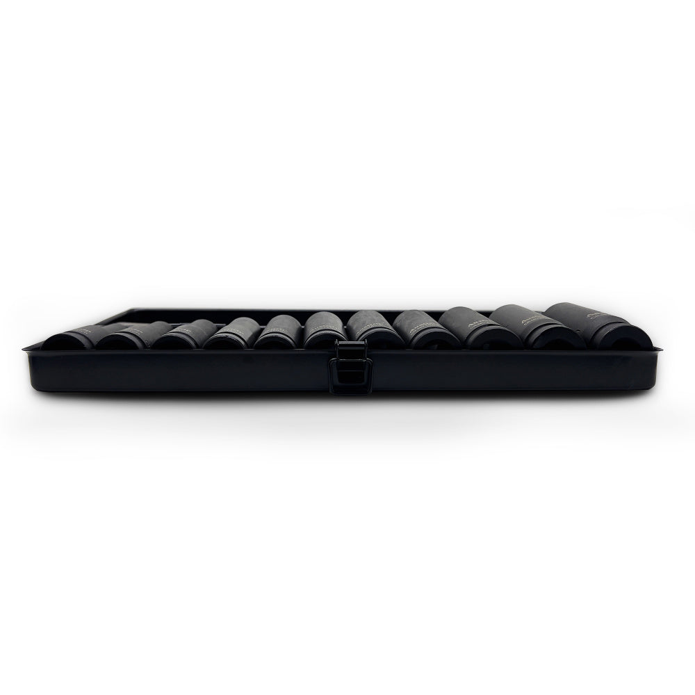 Heavy duty industrial quality impact sockets manufactured from drop-forged Chrome Molybdenum steel with Manganese Phosphate finish for greater corrosion resistance. High visibility laser etched markings for easy socket size identification. DIN standard with *AuzDrive technology. Storage case included.